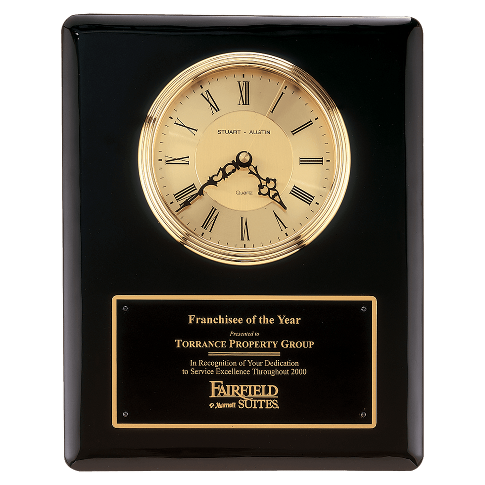 Airflyte Collection - Black piano-finish clock featuring a waterfall bezel with glass lens and gold dial. Clock supplied with quartz movement and includes a solid brass engraving plate.