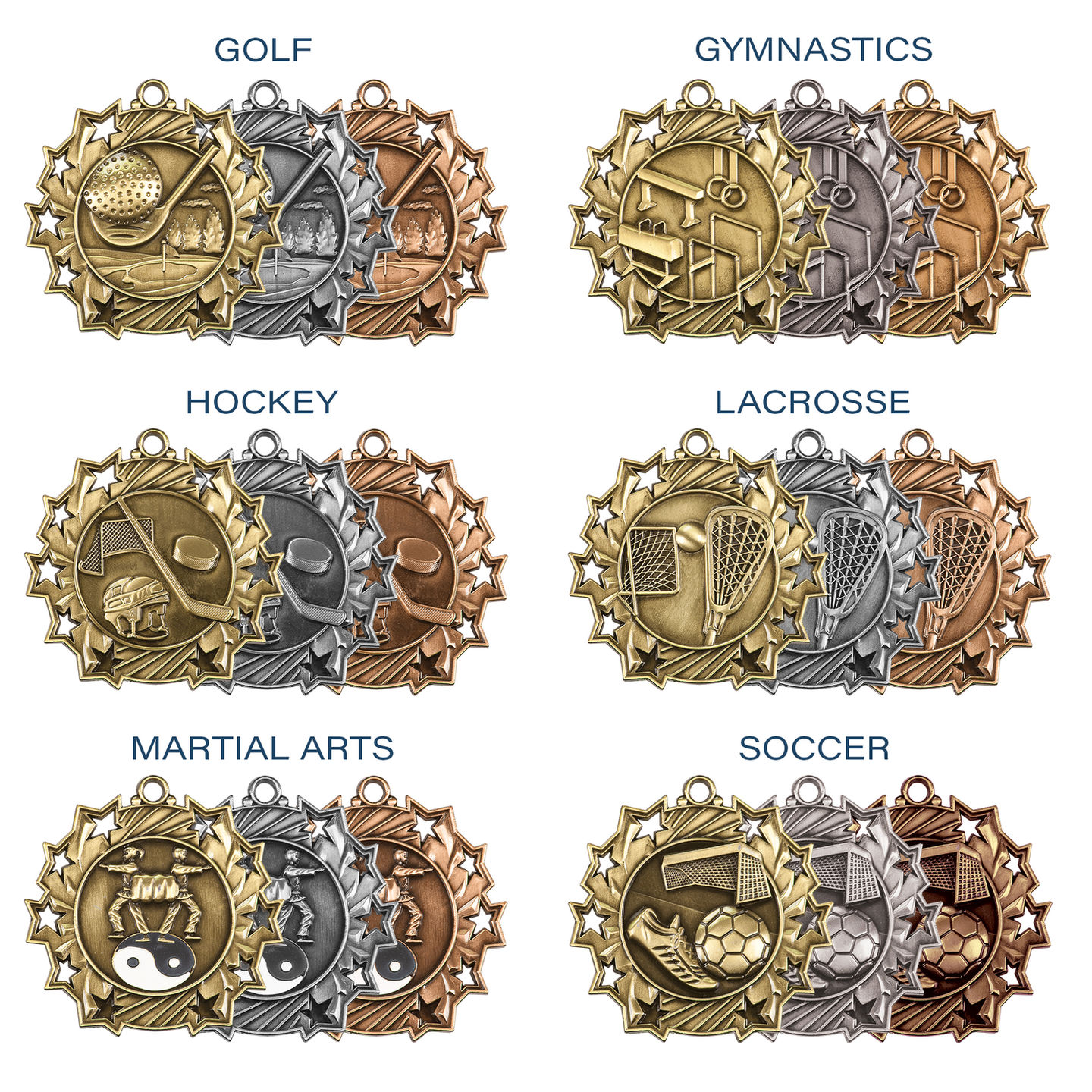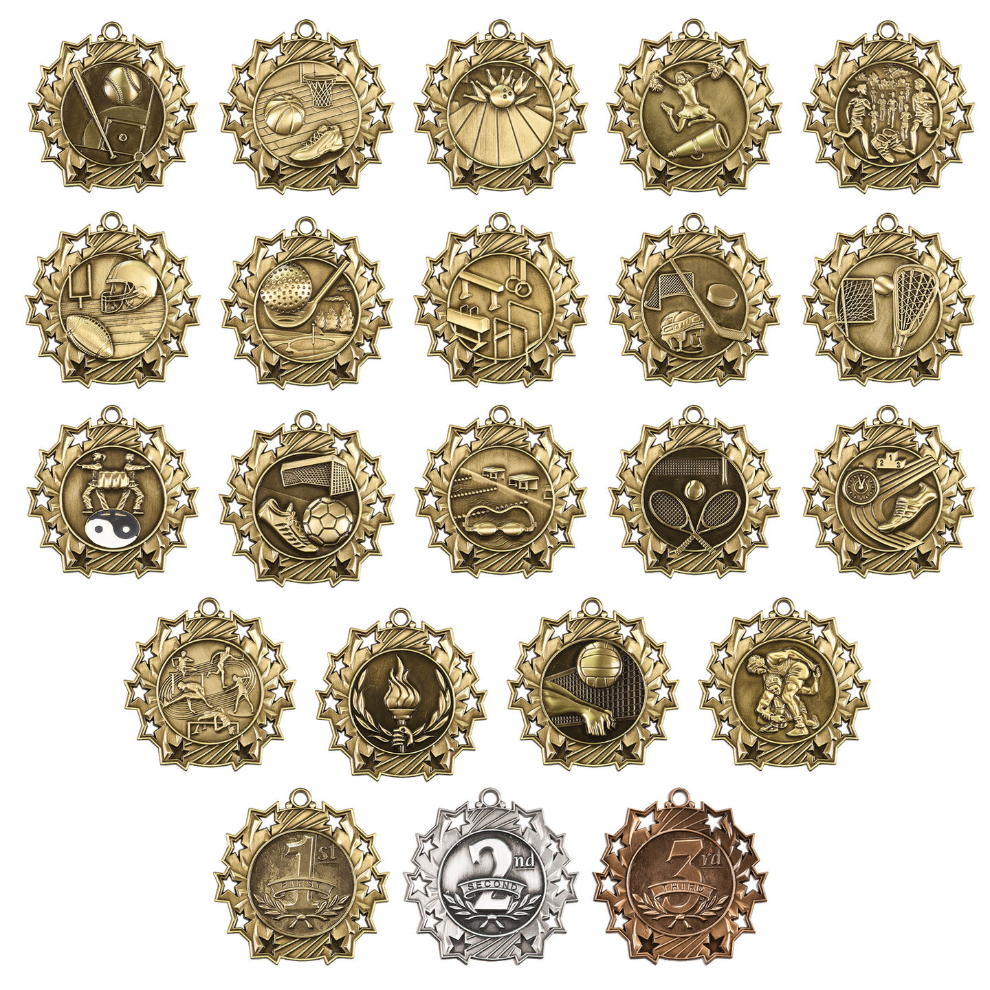 These bold 2.25” Ten Star Medals celebrate achievement in a big way, featuring a striking ten-star design and your choice of Antique Gold, Antique Silver, or Antique Bronze finish. Each medal includes a 7/8” neck ribbon in over 50 color options and is available for a wide range of activities including baseball/softball, basketball, bowling, cheerleading, cross country, football, golf, gymnastics, hockey, lacrosse, martial arts, soccer, swimming, tennis, track, track & field, victory torch, volleyball, wrestling, as well as 1st (gold only), 2nd (silver only), and 3rd (bronze only) place options. Perfect for school events, sports awards, competitions, and recognition ceremonies.