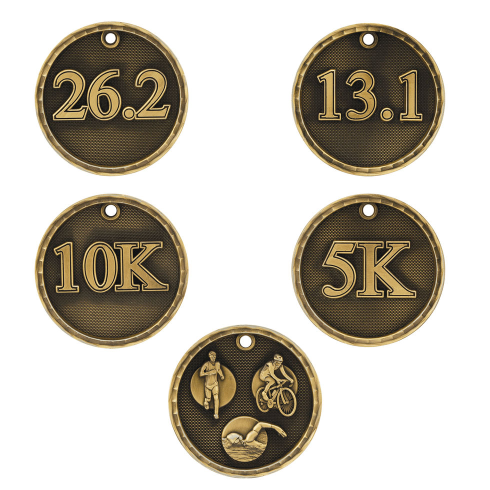 Celebrate finishers in style with these bold 2” 3-D race medals, featuring deep relief detail that makes every accomplishment shine. Available in Antique Gold, Antique Silver, or Antique Bronze and paired with a 7/8” ribbon in over 50 color options. Race themes include 26.2 Marathon, 13.1 Half Marathon, 10K, 5K, and Triathlon. A perfect choice for running clubs, charity events, school races, and community competitions.