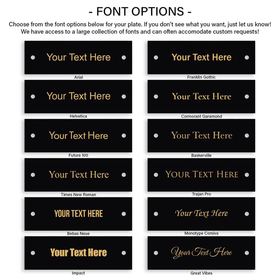Create a personalized black and gold brass engraving plate for plaques, perpetual plaques, awards, memorials, desk pieces, and more. This custom brass plate measures 2.75” x 0.875”, includes 2 screws for easy attachment, and comes with free engraving. There is no extra charge per line, so you can add the text needed to fit your plate layout. It is a great option for replacement plates, monthly perpetual plaque updates, recognition plaques, trophy plates, and custom name plates. Choose from the font options shown in the listing photos, or message if you have a specific font request and we will let you know if we can accommodate it.