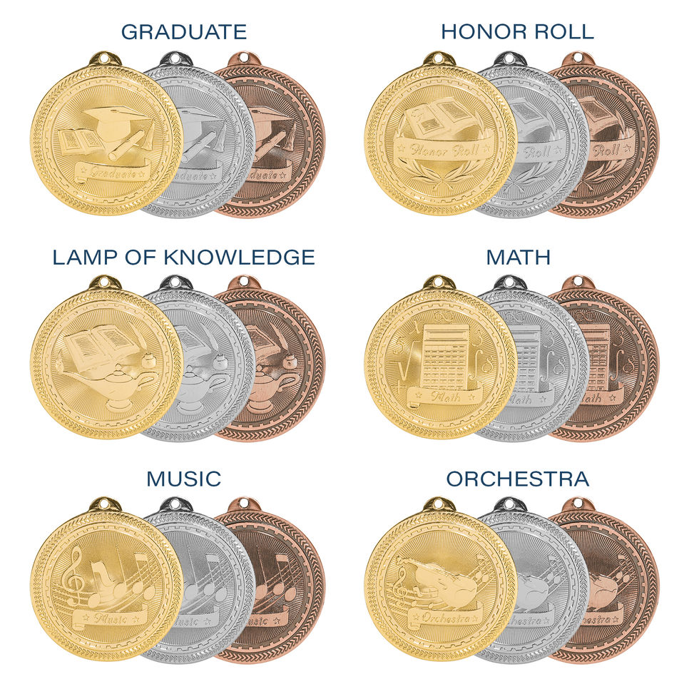 These bright, eye-catching 2” BriteLazer Medals feature a high-shine finish and a smooth black back perfect for personalized engraving. Available in Bright Gold, Bright Silver, and Antique Bronze, each medal comes with a 7/8” neck ribbon in your choice of over 50 colors. Academic designs include art, band, computers, chess, debate, drama, graduate, honor roll, lamp of knowledge, math, music, orchestra, participant, perfect attendance, reading, religious, science, spelling, sportsmanship, and star performer.