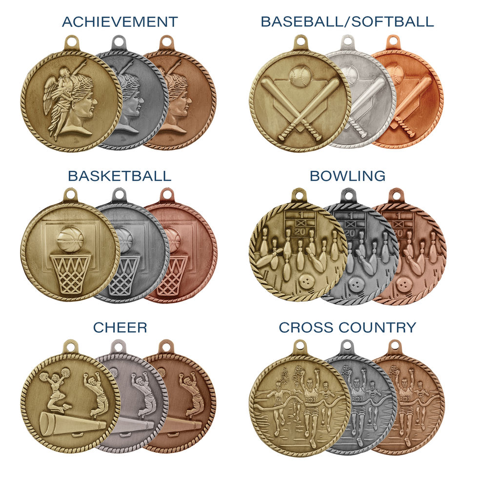 This 2” High Relief Medal delivers a bold, dimensional look that stands out at any event. Available in antique gold, antique silver, and antique bronze, each medal includes a 7/8” neck ribbon in your choice of 50+ colors. Designs available include achievement, baseball/softball, basketball, bowling, cheer, cross country, football, golf, male and female gymnastics, hockey, martial arts, lamp of knowledge, music, soccer, swimming, tennis, torch, track, volleyball, wrestling, and place finishes (1st gold only, 2nd gold or silver, 3rd gold or bronze). The back can be engraved for a personalized finish.