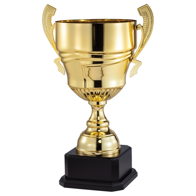 This Italian Metal Cup Trophy features a polished metal cup with a matching metal stem, elegant curved handles, and a rich ebony finish wood base for a refined, high-end presentation. Measuring 22.75” tall, this substantial trophy is available in gold or silver and is ideal for championships, tournaments, and formal recognition events where classic Italian styling and premium materials make a statement. Each trophy includes personalized engraving on the base for a clean, professional finish.
