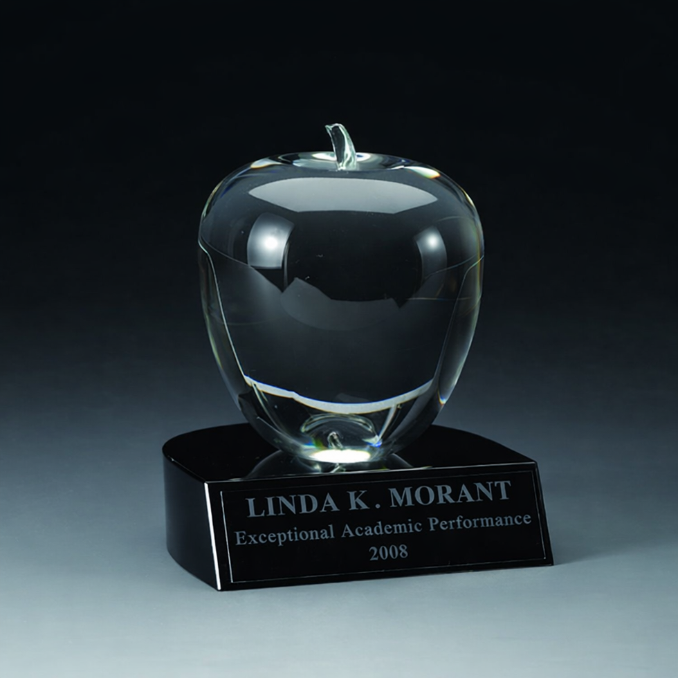 This 4” optical crystal apple is mounted on a sleek black crystal base measuring 4” x 4.5”, creating a refined and professional recognition piece. The clear crystal apple offers excellent clarity and weight, making it an ideal award for academic achievement, educator recognition, corporate milestones, or appreciation gifts. The black base includes an engraving area measuring 4” x 0.875”, providing space for names, dates, or short messages that engrave cleanly for a sharp, high-contrast finish. The combination of the polished crystal apple and solid black base gives this award a timeless, elegant presentation suitable for desks, shelves, or display cases.