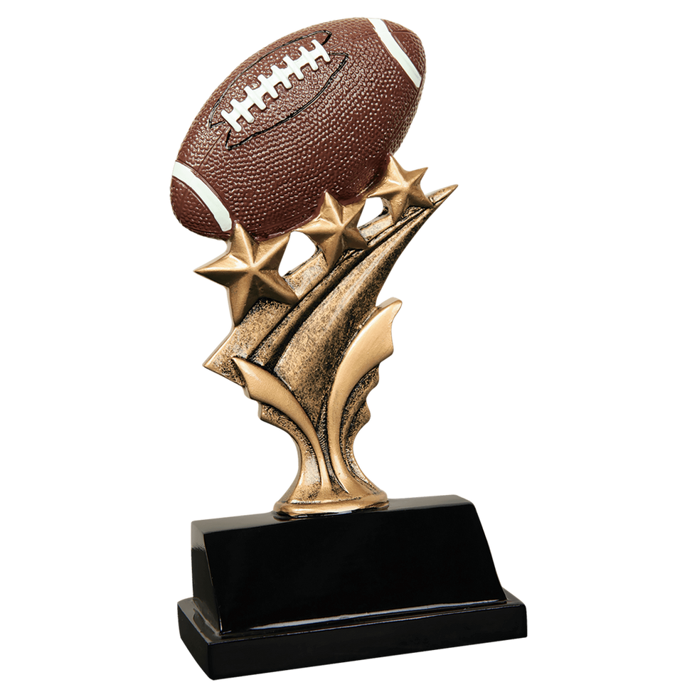 This 5.5-inch Football Tri Star Resin features a bold gold, black, and white design with three rising stars framing the football centerpiece. Made from durable weighted resin and individually boxed, it’s a great choice for tournaments, team awards, or end-of-season celebrations. A personalized plate will be attached to the base with your custom engraving.