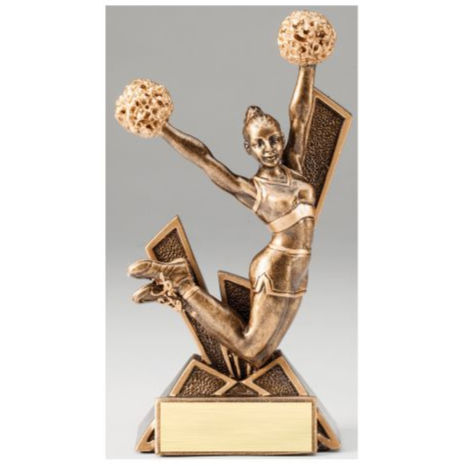 Make a bold and spirited statement with this Checkmate Series Resin Cheerleader Award, featuring an energetic cheerleader captured mid-leap with raised pom-poms bursting through a sharp, geometric backdrop for a dynamic, competition-ready presentation. Standing 6.5 inches tall, this compact but high-impact design showcases movement, confidence, and team spirit in rich antique gold tones with layered texture and crisp sculpted detail, making it perfect for competition wins, spirit awards, MVP honors, pep rally recognition, and end-of-season celebrations.