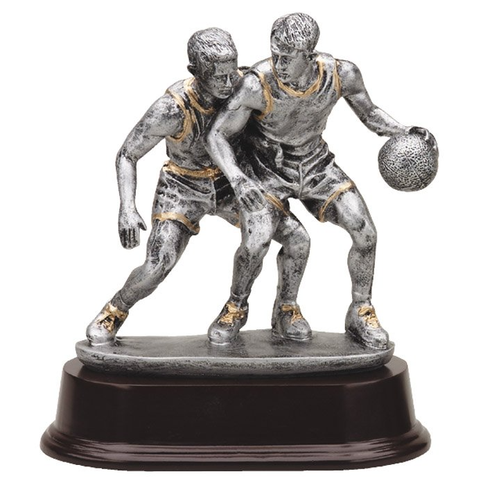 This 6.5” Double Action Male Basketball resin trophy features a dynamic two-player defensive and ball-handling pose with detailed sculpting and subtle gold trim accents that highlight movement and intensity on the court. Crafted from durable resin and mounted on a solid round base with a gold-tone engraving plate, this award captures competitive gameplay and teamwork, making it an excellent choice for MVP recognition, tournament awards, league play, or standout performances. Its compact size and action-driven design make it ideal for youth leagues, school teams, and recreational basketball programs looking for a bold and energetic trophy option.