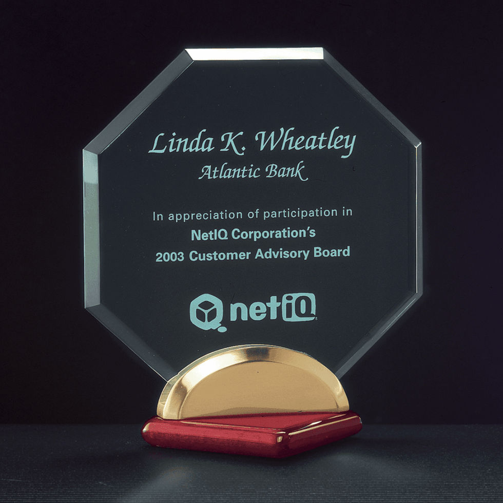 This Octagon Series award features 0.375” thick jade acrylic mounted on a rosewood piano-finish base with elegant gold metal accents. Measuring 6” x 6.5”, it offers a classic and distinguished presentation perfect for honoring achievement, milestones, or exceptional service.