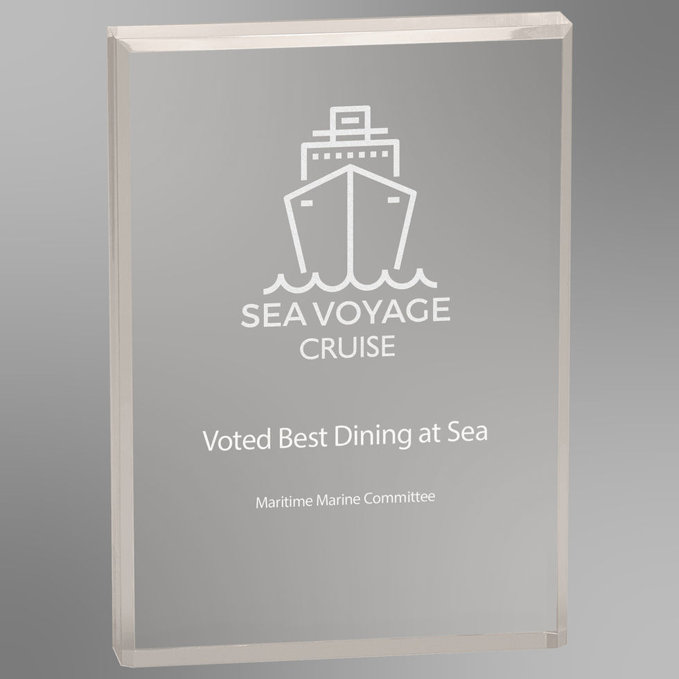 Available in 4” x 6” or 5” x 7”, this 1-inch thick self-standing rectangle acrylic features a beveled front and back edge for a clean, polished look. Perfect for custom engraving to recognize any achievement or special occasion.