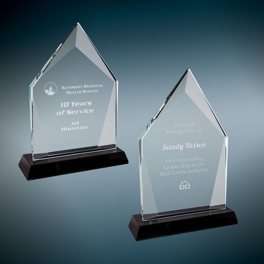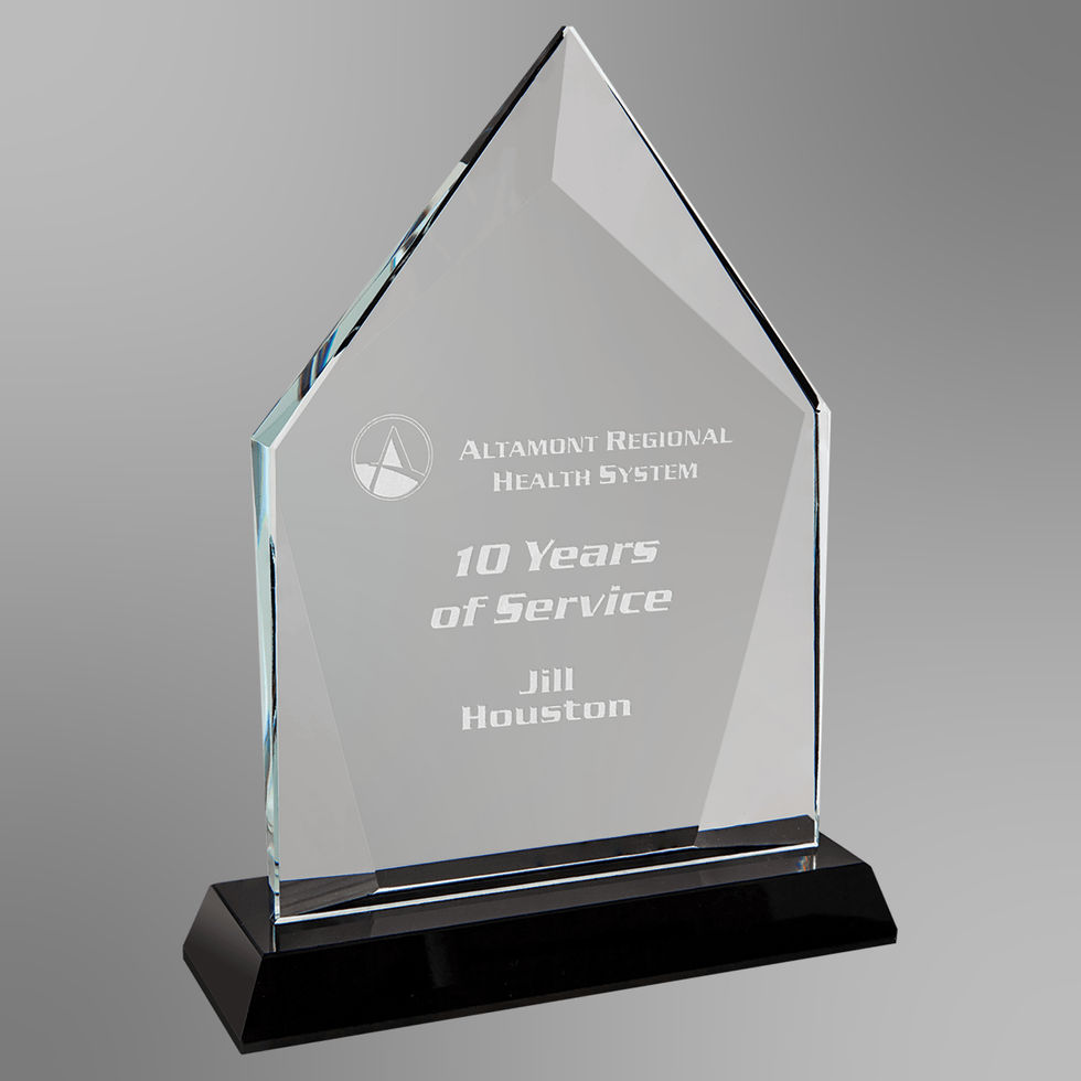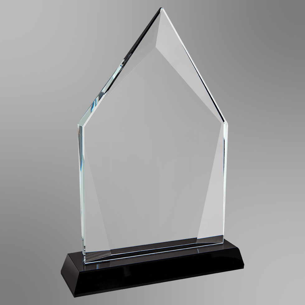 The Diamond Halo Glass Award showcases a sleek diamond shape crafted from premium clear crystal, elegantly mounted on a black glass base. Its crisp lines and reflective surface create a sophisticated display for any engraved message or logo. Each award is individually boxed for an impressive presentation, making it an ideal choice for recognizing excellence and achievement.