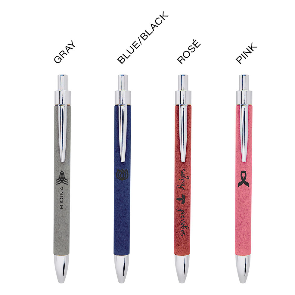 This elegant leatherette pen offers the look and feel of genuine leather with exceptional durability. The richly textured synthetic material is water-resistant, easy to clean, and crafted with high-quality workmanship for a refined finish. Available in 16 colors: light brown, dark brown, black/gold, rawhide, gray, blue/black, rosé, pink, black/silver, rustic/gold, teal, bamboo, red, white, and purple—each pen makes a stylish and personalized gift for any occasion.