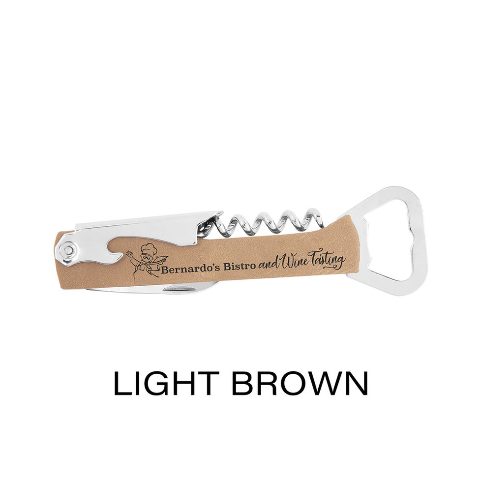 This stylish wine bottle opener is wrapped in durable leatherette and available in 15 color options: light brown, dark brown, black/gold, rawhide, gray, pink, rose, black/silver, rustic/gold, blue/silver, teal, cork, bamboo, red, and white. The richly textured material offers the look and feel of genuine leather while being spot-resistant, easy to clean, and durable for everyday use. Personalization adds a unique touch, making it a perfect gift for weddings, housewarmings, corporate events, or everyday entertaining.
