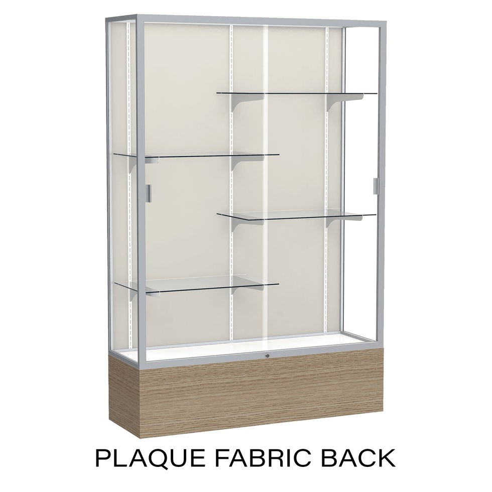 This Reliant Series Display Case combines the strength and durability of aluminum with the refined look of an oak veneer, making it an excellent choice for professional and institutional environments. Measuring 72” high x 48” wide x 16” deep, it features a Driftwood Oak finish exterior paired with anodized satin natural aluminum framing for a clean, modern presentation. Choose from three backing options: Plaque Fabric Back, Mirror Back, or White Laminate Finish Back, allowing the display to be tailored to your space and display needs.